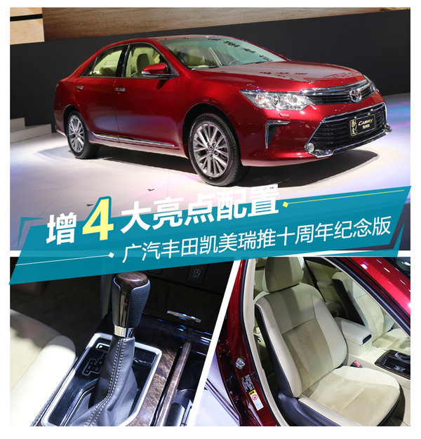 廣汽豐田凱美瑞自2006年登陸中國并實現國產以來,十年間這款車型在華累計銷量已突破150萬輛,并且是同級別車型中以最快速度完成這一目標的。恰逢凱美瑞在華投產、銷售十周年之際,廣汽豐田在長春車展上發布凱美瑞十周年紀念版車型。相比現款凱美瑞,新車實現了4大配置升級,其中包括自動啟停、雙透鏡LED大燈在內的多項細節提升,新車預計將在8月中旬到店上市。