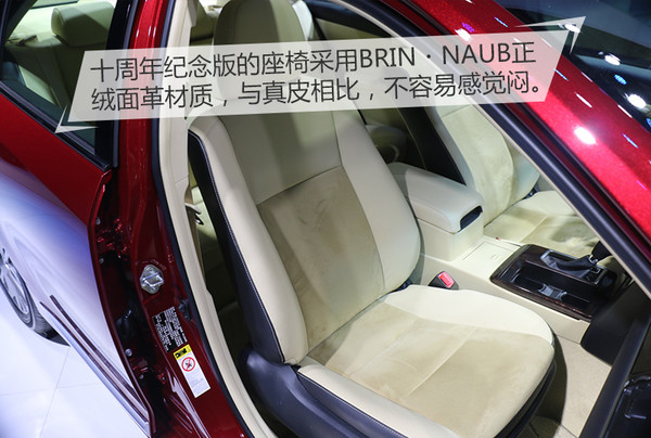 十周年紀念版凱美瑞將原本就已經是真皮包裹的座椅更換了“新裝”,采用了最新研發的BRIN?NAUB材質的正絨面革。與真皮材質相比,這種全新的材料不容易有悶的感覺,夏天的時候不會越坐越熱。冬天的時候,剛坐進車里也不會感覺特別涼,這樣直接省去了再配坐墊的麻煩。BRIN?NAUB材質還具有更好的彈性和延展性,長期坐壓之后不易變形。