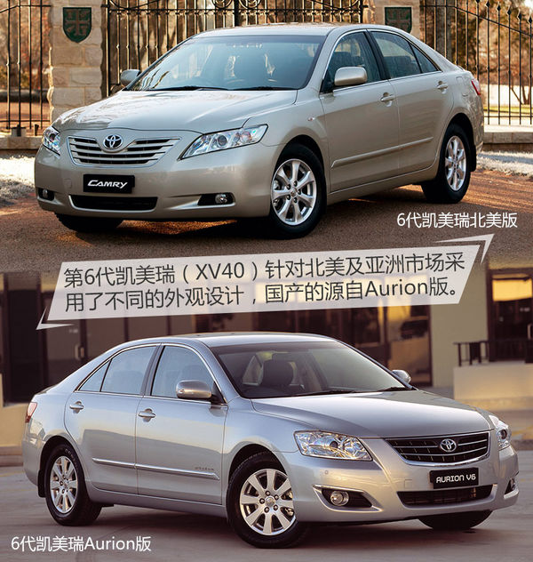 第6代凱美瑞(XV40)誕生于2006年,6月17日正式上市,由廣汽豐田進行本土化生產。雖然是豐田的全球化車型,但是XV40針對北美及亞洲市場采用了不同的外觀設計。北美版的車燈更加“鋒利”更加年輕運動,而國產的凱美瑞則采用了更加符合東方審美的亞洲版造型,又被稱作Prestige版或Aurion版。