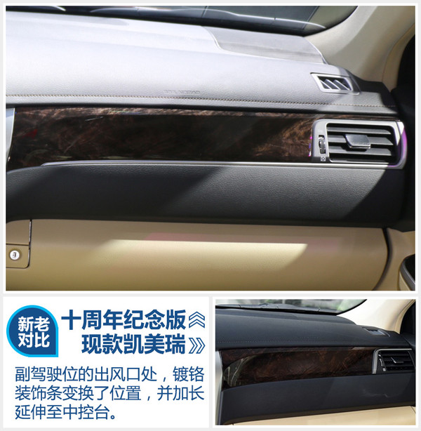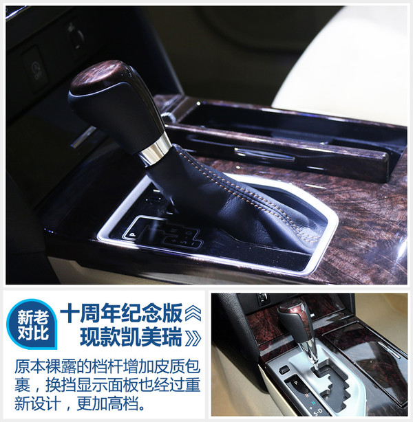 凱美瑞的“蛇形”換擋機制一直是筆者非常喜歡的設計,最起碼在開車的時候不會因為換錯擋而發生意外碰撞。但是說實話,裸露的檔桿總覺得缺了點什么。十周年紀念版將檔桿周圍加上了皮質包裹,立馬將中控臺的“氣質”提升了一個檔次,筆者本人是非常喜歡的。另外,副駕駛面前的木紋面板也增加了一條鍍鉻裝飾。