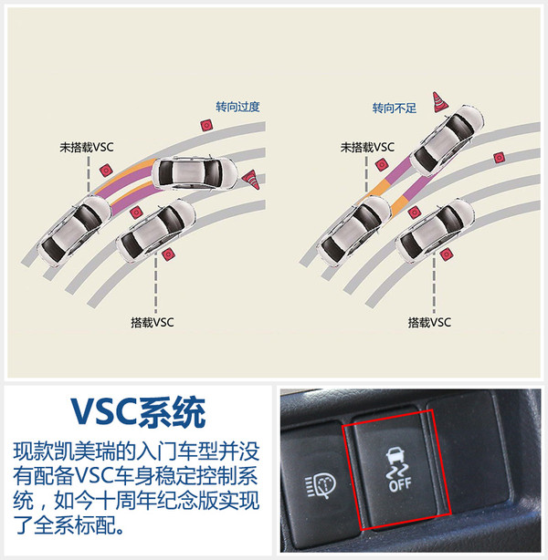 目前在售的現款凱美瑞入門版車型,并沒有配備VSC車型穩定控制系統,這對于預算有限的消費者來說,原本可以成為購買目標的凱美瑞,很有可能就因為這一個配置被篩掉了。如今,十周年紀念版實現了全系車型標配VSC系統。