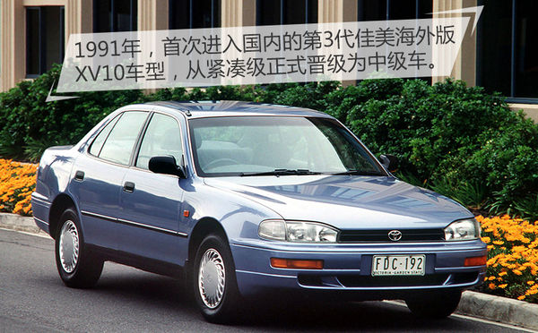 在5代之前,最先進口引入國內的是第3代佳美,這是非常具有歷史意義的一代車型,不但正式確立了佳美在豐田“全球車”陣營中的主力位置,還順帶打開了中國市場。首次進入國內市場的是第3代佳美(1991-1996)針對海外市場推出的XV10車型,與日本本土的V30不同,XV10從一輛緊湊級轎車“成長為”一輛B級車。