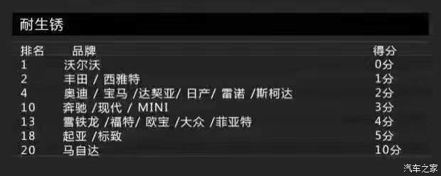 接下來這個項目的得分情況讓小編的心碎了一地,那就是耐生銹品質。沃爾沃一如既往的穩(wěn)定,憑借0分的表現(xiàn)力挫群雄,險勝豐田及西雅特這兩個品牌。值得關注的是,這次的倒數(shù)第一名竟換成了馬自達,日系得了10分實屬少見。本來小編就打算入手一臺阿特茲,看到這個表現(xiàn),立馬變得很猶豫了有木有!生銹,生銹,居然生銹?