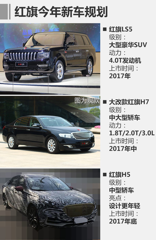作為國內自主車企中較早涉獵“豪華汽車”領域的品牌,紅旗已擁有針對公務行政和私人消費市場的LS5和H7兩款產品,未來其還將進一步擴充產品陣容。中國一汽紅旗分公司總經理韓新亮表示,“十三五”期間,紅旗將迎來產品線的爆發。另據網通社獲得的消息,紅旗將在今年到2020年間陸續推出8款新車型,其中全新豪華大型SUV——LS5等3款新車將于年內上市銷售。