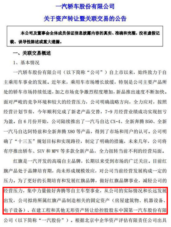 根據此前公告,一汽轎車根據資產評估的結果,在和一汽集團協商一致的前提下,將評估價值為3.7億元的紅旗旗下資產,以含增值稅人民幣 4.2億元的交易價格轉讓給一汽股份,并且表示, 本次資產轉讓的關聯交易已經在第七屆董事會第七次會議中審議通過,在交易合同簽署生效后20天內一汽股份需要向一汽轎車支付轉讓資產價款。這意味著,紅旗品牌已歸屬于一汽股份所有,從一汽轎車中獨立出來。(圖/文 網通社 陳旭明)