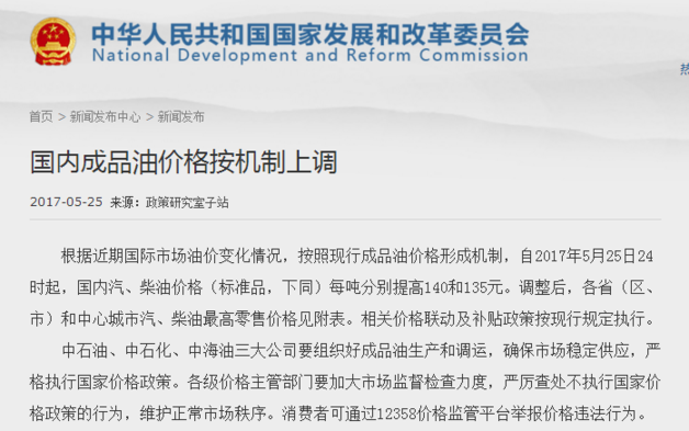 昨日(25日),國家發展和改革委員會發布消息稱,根據近期國際市場油價變化情況,按照現行成品油價格形成機制,自2017年5月25日24時起,國內汽、柴油價格(標準品,下同)每噸分別提高140和135元。相關價格聯動及補貼政策按現行規定執行。