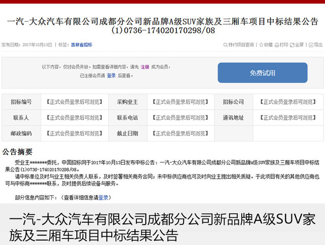 日前,中國招標網正式公布了《一汽-大眾汽車有限公司成都分公司新品牌A級SUV家族及三廂車項目中標結果公告》從公告上來看,一汽-大眾汽車有限公司正在成都工廠準備新品牌A級SUV兩款車型以及另外一款三廂車項目。該項目主要用于投產一汽-大眾全新經濟用車品牌,以滿足消費者對廉價車的購買需求。