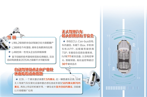 當前,L1和L2級別半自動駕駛已經大規模量產;L3級將在今年落地,明年會有更多應用;L4級也有一些龍頭企業在積極探索。但是,針對“2030年左右就可實現無人駕駛產業化”的預測,專家則持謹慎態度。要真正實現完全意義上的無人駕駛,還面臨著安全、成本等一系列難題,需要產業界和全社會合力推動解決。