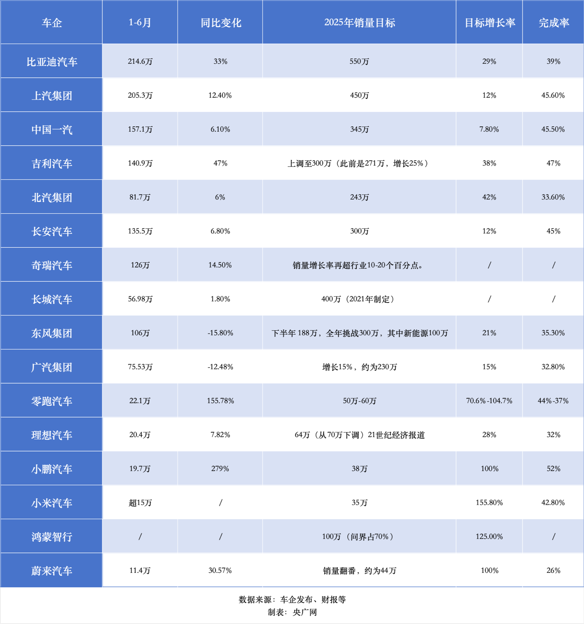 其中,1-6月自主品牌零售市場份額為64%,較去年同期增長7.5個百分點。傳統車企中,吉利汽車、比亞迪汽車、奇瑞汽車等頭部車企憑借新能源板塊的拉動,成為自主品牌中增速較快的三家車企。 但同時,分化也在進一步加劇,廣汽集團、東風集團等車企處于下滑狀態。 新勢力的格局也在重構。零跑汽車、理想汽車、小鵬汽車成為新勢力三強,并且,零跑汽車、小鵬汽車也將盈利提升為年度目標計劃。 然而從年度銷量目標完成率來看,據央廣網不完全統計,僅小鵬汽車完成率超50%(其中吉利汽車因上調目標導致不及50%),整體來看,完成率在30%-40%之間的有5家,低于30%的有1家,超過40%的有7家。 那么,在行業分化與目標完成率普遍不足50%的背景下,隱藏著中國汽車市場怎樣的變化? 分化加劇,部分車企陷入增長困境 今年上半年,中國汽車市場呈現出明顯的分化態勢,自主品牌份額持續提升,而不同車企的表現則因戰略調整、市場應對等因素拉開差距,部分車企陷入增長困境。 乘聯會秘書長崔東樹分析稱,上半年自主品牌在新能源市場和出口市場獲得明顯增量。 吉利汽車、比亞迪汽車、奇瑞汽車等頭部車企憑借新能源板塊的拉動增速較快,三者的共同特征是:將新能源產品置于戰略核心,通過密集的新品投放(如吉利銀河、奇瑞 iCAR)搶占市場。 比亞迪汽車已經全面新能源化,吉利汽車、奇瑞汽車仍然處于轉型階段,但新能源增速較快。吉利官方數據顯示,1-6月新能源板塊銷量達72.5萬輛,同比增長126%。奇瑞上半年新能源銷量35.9萬輛,同比增長98.6%。 另一個增量來自出口,乘聯會數據顯示,今年上半年,自主新能源出口81萬輛,同比增長109%,占自主出口38.6%。 上半年奇瑞仍然保持出口第一,出口量達55萬輛,同比增長3.3%。比亞迪上半年出口量超47萬輛,創同期新高。提升出口占比也成為包括比亞迪在內等車企今年的重要目標。 產品結構調整情況也直接影響車企對2025年的目標增長預期。產品結構以新能源為主、新車型計劃豐富的車企,普遍預期較高,比亞迪汽車、吉利汽車、奇瑞汽車的年度增長目標均在30%左右。 然而,并非所有車企都能跟上市場節奏。新能源汽車正成為車企表現的分水嶺,加劇了行業分化。長城汽車自2021年公布計劃2025年實現年銷400萬輛目標后,年度目標一直沒有更新。今年上半年長城汽車銷量56萬輛,與此前的目標相去甚遠。其中新能源車銷量為 16.04 萬輛,新能源汽車銷量占比約為 28.16%。 央廣網記者從長城汽車相關人士獲悉,近期在35周年之際,長城汽車將公布最新的戰略,涉及到年度銷量目標調整。 廣汽集團、東風集團面對的局面更加艱巨。繼2024年下滑后,今年上半年,兩家集團仍然同比下滑。其中,廣汽集團僅廣汽豐田上半年同比增長,東風集團則受到東風日產、東風本田等合資板塊下滑的影響較大。 2025年的格局分化,不僅影響短期市場排名,更將決定2025年決賽圈的玩家座次。這一點,今年上半年新勢力的表現尤為明顯。 新勢力在今年上半年也經歷洗牌,頭部三強由零跑汽車、理想汽車、小鵬汽車憑借爆款車型和差異化策略搶占先機。 小鵬汽車、小米汽車、鴻蒙智行等,年度增長目標均在100%以上,今年上半年新勢力第一名零跑,年目標增長也在70%-100%之間。在新車型的拉動下,小米汽車、小鵬汽車均提高了年度目標,小米汽車從30萬輛提升至35萬輛,小鵬汽車也在一季度財報電話會上宣布年度目標上調至38萬輛。 理想汽車則下調了年度目標。據21世紀經濟報道此前報道,今年理想汽車將年度銷量目標從70萬輛下調至64萬輛。也是目前唯一公開下調年度目標的車企。 盡管新能源汽車正在決定汽車行業的分化走向,但北方工業大學汽車產業創新研究中心研究員張翔也提醒,得益于今年補貼政策的推動,進一步刺激了新能源汽車的銷量。 “年底新能源汽車免購置稅政策停止,到明年要收一半,這對增速較快的新勢力來說是一個不好的消息,假如一輛新勢力的車型售價20萬元、購置稅是10%的話,按照購置稅減半,可能明年這個車的價格就要比今年貴一萬多元。消費者的購車興趣就會下降。”張翔說。 基于此,張翔建議,現階段新勢力要積極利用規模效益降低成本,讓自己的產品在市場上有競爭力,通過技術創新來降低成本,以抵消明年購置稅減半政策的影響。 普遍增長、目標完成率不足50%背后 央廣網統計的各大汽車集團、車企公布的銷量數據,目前,蔚來汽車的目標完成率低于30%,比亞迪汽車、北汽集團、東風集團、廣汽集團、理想汽車5家車企的目標完成率在30%-40%之間,上汽集團、中國一汽、吉利集團、長安汽車、零跑汽車、小鵬汽車、小米汽車7家車企的完成率超過40%。此外,奇瑞集團、長城汽車、鴻蒙智行等因數據不完善此次不計入統計。 關于上半年車企目標完成率普遍低于50%的問題,張翔接受央廣網記者采訪時稱,中國汽車市場的規律是上半年銷量要比下半年低,年底時車企喜歡促銷沖量,很多消費者也習慣于年底購車,因此通常車企下半年銷量普遍高于上半年。 在上半年節點,車企目標完成率達到多少才算正常? 崔東樹向央廣網記者表示,上半年車企完成率低于40%屬正常情況。這一觀點得到張翔的認同,他解釋道,車企全年指標規劃通常留有一定余地,實際完成70%-80% 便等同于達成任務。 至于車企為何設定較高目標,張翔認為,當前汽車行業正處于優勝劣汰階段,在競