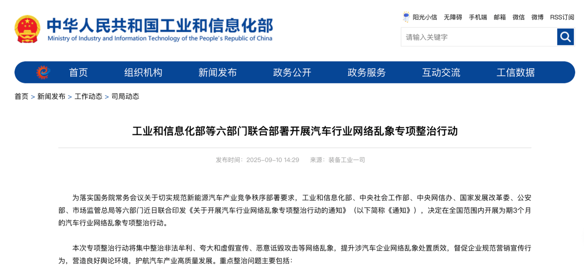 央廣網北京9月10日消息(記者董楠)9月10日,工業和信息化部(以下簡稱“工信部”)、中央社會工作部、中央網信辦、國家發展改革委、公安部、市場監管總局等六部門聯合印發《關于開展汽車行業網絡亂象專項整治行動的通知》,決定在全國范圍內開展為期3個月的汽車行業網絡亂象專項整治行動。
