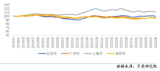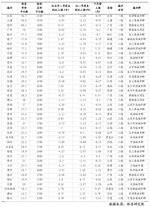 三季度,一線城市租金成交價同比跌幅高于二線城市,一線城市除北京微漲外,上海、廣州、深圳均同比下跌
