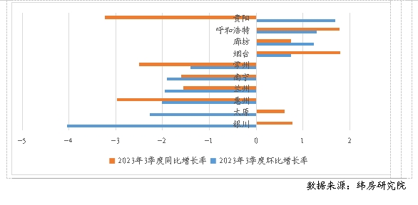 住房大數據監測的重點40城中包括10個三線城市,其中4個城市三季度住房租金環比上漲,6個城市環比下降。其中,貴陽和呼和浩特環比漲幅最高,分別為1.69%和1.30%。與去年三季度末相比,5個城市住房租金低于去年同期水平,5個城市高于去年同期水平。其中,貴陽和惠州住房租金跌幅最高,分別為3.24%和2.98%;煙臺和呼和浩特漲幅最高,分別為1.8%和1.78%。