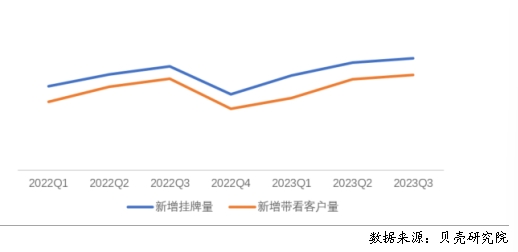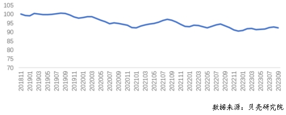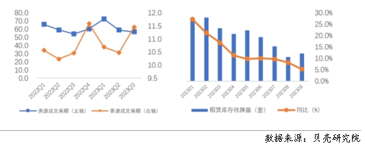 根據貝殼研究院數據,全國重點40城三季度房客源成交周期分別為56.7、11.5天,房源成交周期環比減少2.1天,同比增加2.7天;客源成交周期環比延長1天,同比延長1天。隨著個人租賃房源供應的增加,疊加保障性租賃住房、市場化集中式租賃房源的增加,個人業主出租房源出租速度減緩。從庫存房源來看,今年1-9月租賃庫存房源量均呈現同比增加的趨勢,與此同時,租客租房面臨的選擇項增多,租客對于租賃房源可選類型和房源量均有增加。