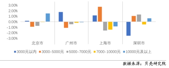 貝殼研究院數據顯示,一線城市呈現不同程度的重心下移,同時北京、深圳還呈現出延遲購房“購轉租”的特征,高套均支出區間的租賃房源成交增加。上海和廣州租賃重心下移態勢明顯。上海套均租金5000元以內的成交占比增加了將近4個百分點,5000元以上的占比均呈現減少趨勢,尤其是套均租金在5000-10000元區間的房源占比;廣州套均租金在3000元以內的增加了1.8個百分點,3000元以上的均呈現減少趨勢。