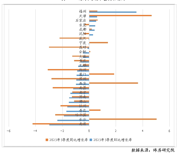 住房大數據監測的26個二線城市中,僅有6個城市的住房租金環比上漲,20個城市的住房租金環比下跌。其中,南通和長沙降幅最高,分別為2.97%和2.36%,其余城市降幅均不超過2%;福州漲幅最高為3.53%,其余城市漲幅均不超過1%。與2022年三季度末相比,住房大數據監測的26個二線城市中有16個城市住房租金同比下降,10個城市住房租金同比上漲。其中,南通、鄭州、昆明等城市住房租金同比跌幅最大,分別下跌4.23%、3.09%和3%;長沙、天津、西安等城市住房租金同比漲幅最大,分別上漲5.03%、4.66%和3.65%。