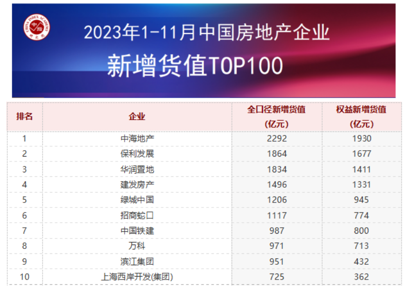 根據中指研究院數據顯示,中海地產、保利發展、華潤置地占據新增貨值榜單前三位。2023年1-11月,中海地產以累計新增貨值2292億元占據榜單第一;保利發展、華潤置地緊隨其后,累計新增貨值規模分別為1864億元和1834億元。TOP10企業2023年1-11月新增貨值總額13442億元,占TOP100企業的41.7%;TOP100企業新增貨值門檻為121億元。