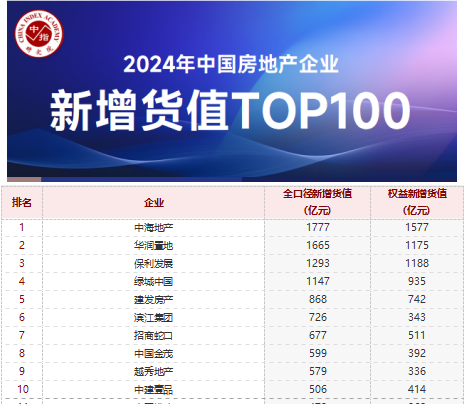 綜合多家機構統計,從新增貨值來看,中海地產、華潤置地和保利發展位列前三。2024年,中海地產以1777億元新增貨值占據榜單第一,華潤置地、保利發展分別以1665億元、1293億元,位列第二、第三名。