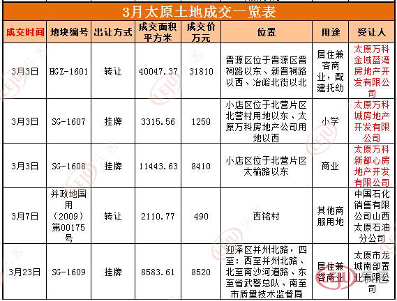 新浪樂居訊2016年已走完第3個月,隨著太原房地產市場持續回暖,各大房企的新項目陸續面世,太原土地市場也日漸活躍,其中最為明顯特點是這一月城中村改造用地集中供應。本月,太原土地市場共有5宗地成交,萬科拿下其中3宗用地,成最大贏家,此外,本月土地市場共有5宗地出讓,其中4宗來自于城中村改造用地。 相較于2月份3宗用地掛牌出讓,本月太原土地市場的供應量有所增多,環比上漲67%;土地成交方面,相較于2月份5宗用地成交,本月土地成交環比下跌20%,而在成交面積和成交額方面,本月均出現下滑。(詳見下表)