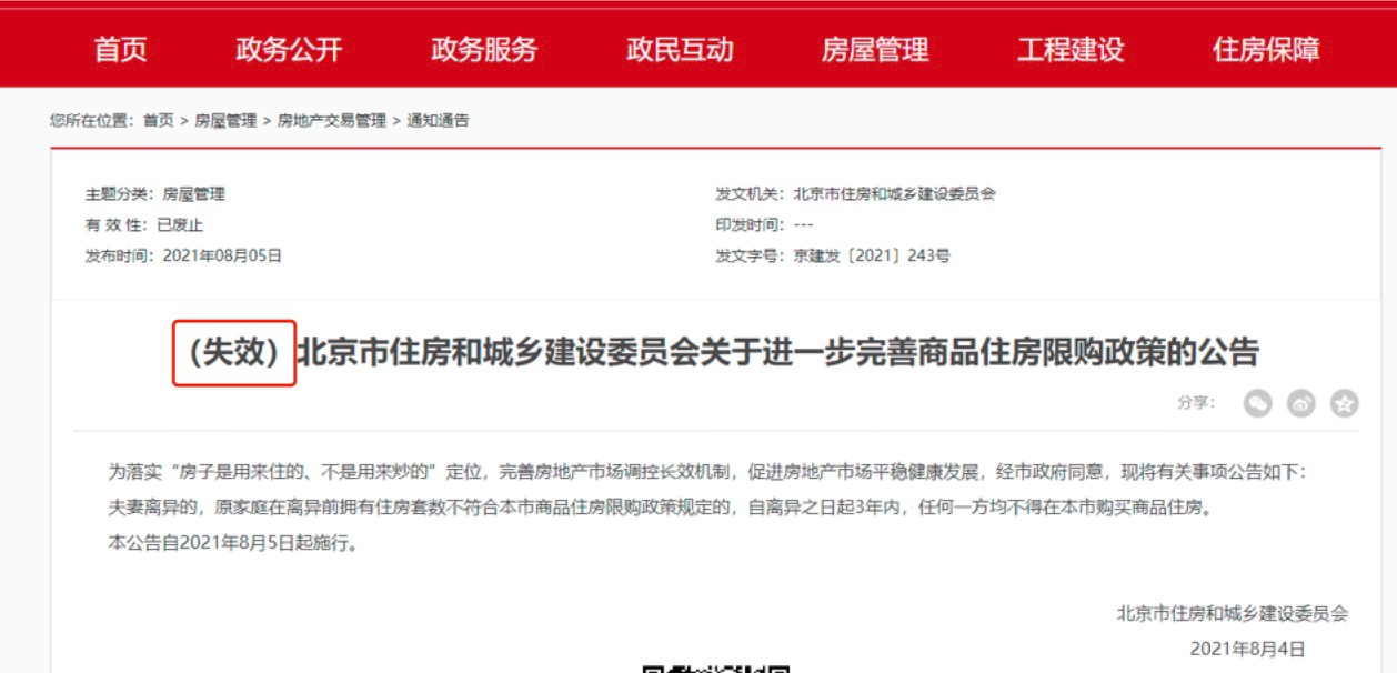 2021年8月4日,北京市住建委發文規定,夫妻離異的,原家庭在離異前擁有住房套數不符合本市商品住房限購政策規定的,自離異之日起3年內,任何一方均不得在本市購買商品住房。