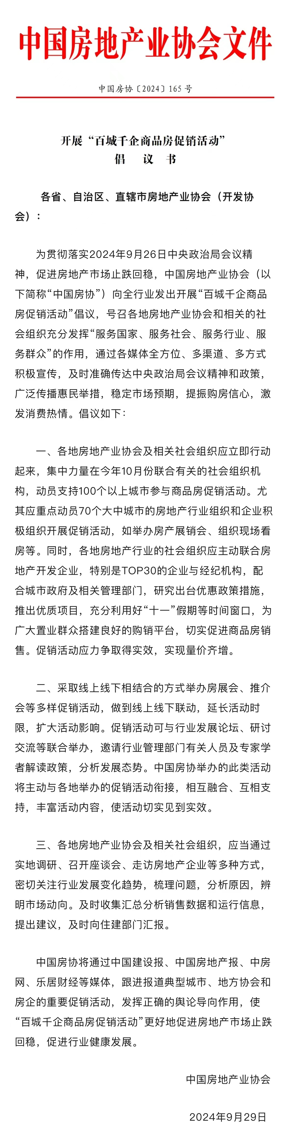 央廣網北京10月11日消息(記者安垚)據中國房地產業協會微信公眾號消息,為貫徹落實9月26日中央政治局會議精神,促進房地產市場止跌回穩,在住房和城鄉建設部的指導下,9月29日,中國房地產業協會(以下簡稱“中國房協”)發出開展“百城千企商品房促銷活動”倡議。