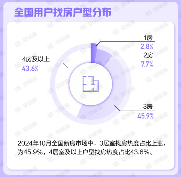 在用戶找房戶型方面,3居室仍為現階段熱度較高的戶型,找房熱度占比上漲,為45.9%,4居室及以上戶型找房熱度占比43.6%。張波分析稱,改善潛在需求入場的趨勢表現明顯,10月全國購房群體中三、四房的需求占比持續提升,二手房交易稅費的減免加之利率下行,是推動改善需求積極入市的組合性政策效果表現。