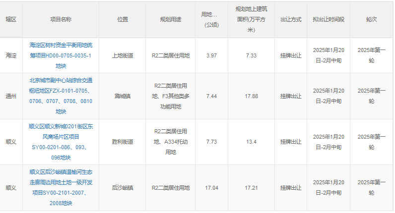 同一天,北京市規劃和自然資源委員會網站發布了2025年度第一輪擬供應商品住宅用地清單,共涉及4宗地,土地面積約36.18公頃,建筑規模約55.82萬平方米,將于2025年2月中旬供應。整體來看,本輪推出地塊均位于市場需求突出、基礎設施和公共服務配套較好的區域,共涉及海淀、城市副中心、順義新城和后沙峪4宗地。