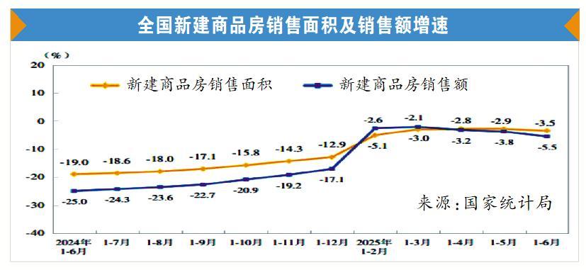 根據國家統計局發布的2025年上半年全國房地產市場基本情況,上半年,新建商品房銷售面積45851萬平方米,同比下降3.5%;其中住宅銷售面積下降3.7%。新建商品房銷售額44241億元,下降5.5%;其中住宅銷售額下降5.2%。6月末,商品房待售面積76948萬平方米,比5月末減少479萬平方米。其中,住宅待售面積減少443萬平方米。