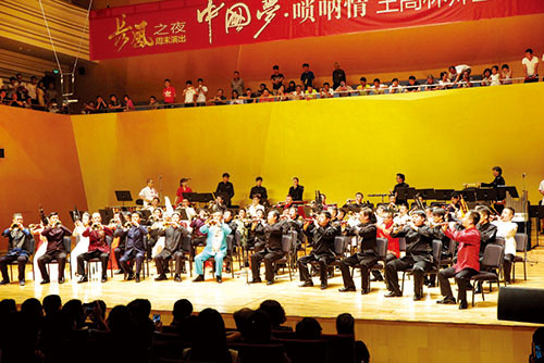 本報訊 嗩吶悅耳、笙簫婉轉,一曲吹打樂《大得勝》直擊觀眾心扉;60多名演奏成員配合默契、技藝高超,贏得觀眾陣陣掌聲。6月17日晚,由山西省文化廳、山西大劇院主辦,山西演藝集團歌舞劇院民族樂團演出的“長風之夜”文化惠民活動——“《中國夢·嗩吶情》王高林師生嗩吶音樂會”在山西大劇院音樂廳精彩奏響。