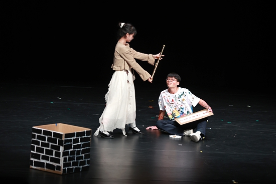 在本屆大賽的主競(jìng)演單元,學(xué)生們需要圍繞首日公布的元素詞,隨機(jī)組隊(duì),開(kāi)展為期10天的限時(shí)創(chuàng)作,創(chuàng)作出20分鐘的原創(chuàng)劇目。盧昊欣第一次登上這么大的劇場(chǎng),5人小組帶來(lái)一部名叫《左右》的戲。