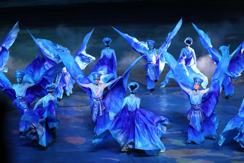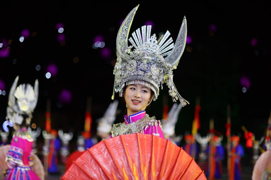9月20日晚,演員在貴州省雷山縣大塘鎮表演苗族歌舞詩劇《仰歐桑》。新華社記者 楊文斌 攝