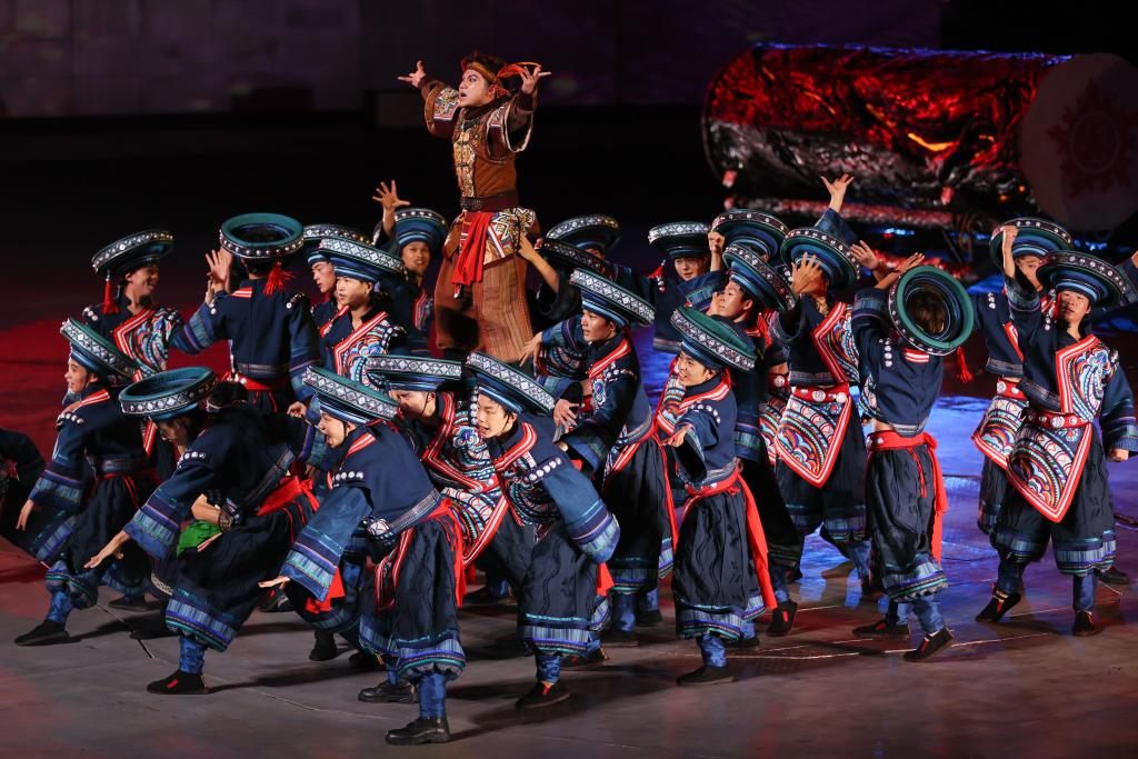 9月20日,演員在貴州省雷山縣大塘鎮表演苗族歌舞詩劇《仰歐桑》。新華社發(楊武魁攝)