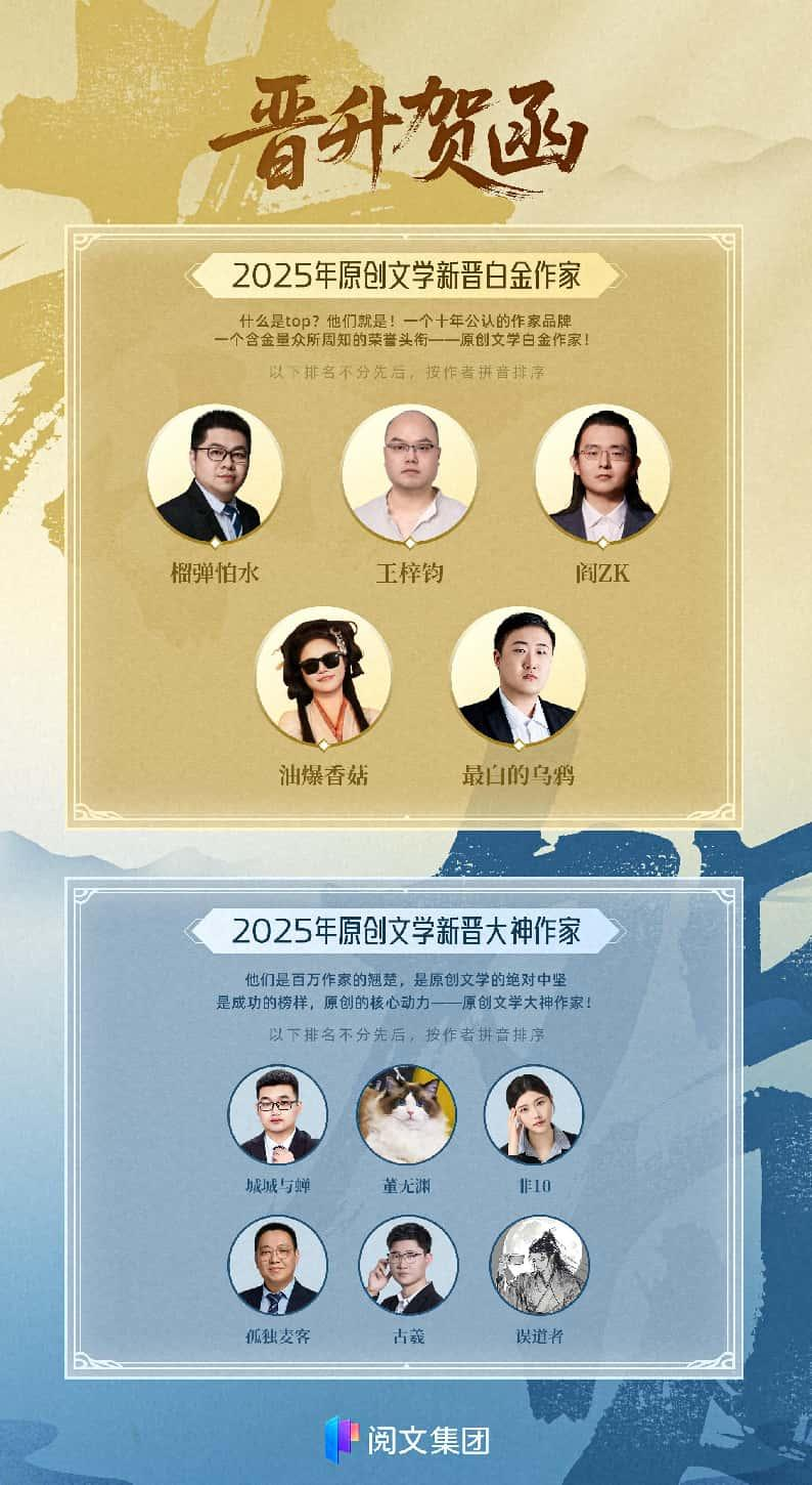 | 2025年閱文“白金大神”作家名單出爐:新人崛起,創作深度顯著增強 |