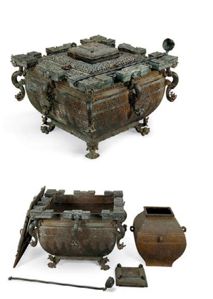 影片中用于冰酒的銅鑒缶正是出自于湖北省博物館館藏曾侯乙銅鑒缶,它由外部的鑒、鑒內置的缶組成,是中國最早的“冰箱”。在鑒的內部放上缶,中間的空隙放上冰塊,可在祭祀和宴饗時冰鎮酒。“以古為鑒”“擊缶而歌”等成語亦由此衍生而來。