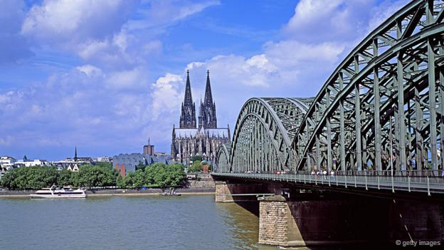 科隆霍亨索倫橋始建于第一次世界大戰(zhàn)前,該橋設(shè)計獨特,體現(xiàn)了當時石材工程與鋼鐵結(jié)構(gòu)的完美結(jié)合。大橋于1911年完工,橋長共409米,橫跨萊茵河。1945年3月,為了減緩盟軍向柏林行進的速度,橋梁被德軍炸毀。現(xiàn)在該橋已被成功修繕并成為德國最繁忙的鐵路線路。橋上的鋼鐵結(jié)構(gòu)形似鯨魚的脊背,柵欄上掛滿了情侶們的“愛情鎖”。如今這座橋已經(jīng)成為團結(jié)和愛的象征。