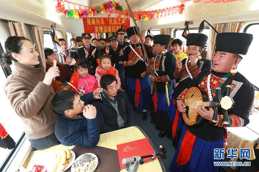 2月1日,彝族藝術家在K165次列車上為旅客表演。當日,在西安鐵路局西安至昆明的K165次列車上,四川美姑縣原生態畢摩樂隊與西安客運段職工民樂小分隊聯合舉辦“英雄列車民族之聲親情溫暖回家路”音樂會,畢摩樂隊用口弦、哈門、木葉、瑪布等彝族民間樂器演奏的音樂為返鄉過年的旅客提前送上新年祝福。民間藝術家和列車乘務員還為旅客們送上“福”字、春聯。新華社發