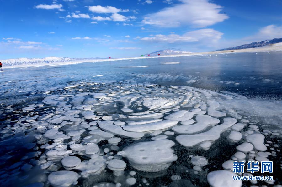 2月20日在新疆博爾塔拉蒙古自治州境內的賽里木湖拍攝的湖面結冰后形成的冰花奇觀。進入2月份后,新疆海拔最高的湖泊賽里木湖湖面全部結冰,在湖邊的一些小泉眼處,不停泛出的氣泡在冷空氣作用下,迅速凝結,形成了如冰柱、螺旋紋等形式多樣的冰花奇觀,令人嘆為觀止。新華社發(沈志君 攝)