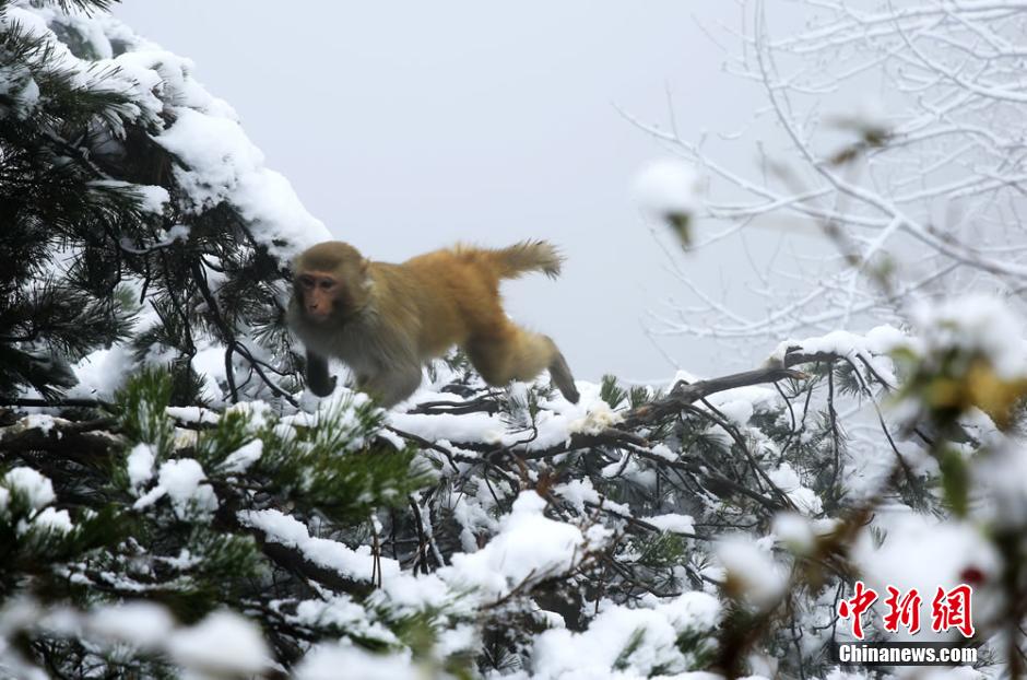 2月22日正值元宵佳節,湖南張家界核心景區武陵源喜降春雪。在黃石寨景區,成群的野生獼猴或在雪中追逐戲鬧,或在樹枝上攀爬跳躍,或蜷縮著身子賣萌,成為張家界武陵源的一道春季新景。吳勇兵 攝