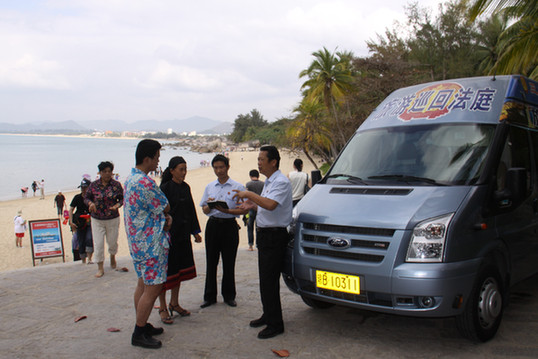 2011年初,三亞市特批專款70多萬元,為旅游巡回法庭配置兩輛巡回審判車,車上設有國徽、法臺、原被告席、當事人座椅,還配備電腦、打印機,能即時制作裁判文書。從此,兩輛可以快立、快裁、快調(diào)、快結(jié)、快執(zhí)的巡回審判車開進了三亞各個景點,真正實現(xiàn)了哪里有旅游投訴和糾紛,巡回審判車就在第一時間趕到哪里。