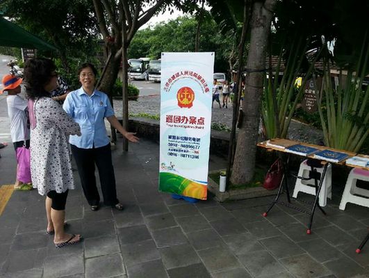 2002年4月,在充分調(diào)研基礎(chǔ)上,三亞市城郊人民法院依托天涯、崖城、藤橋3個人民法庭,設立了天涯海角、南山和亞龍灣三大國家級旅游景區(qū)旅游巡回法庭,在重大節(jié)假日全天候、平時不定期進駐景區(qū)開展法律服務,巡回辦案,適用簡易程序就地化解矛盾糾紛,成為全國首創(chuàng)的“景區(qū)移動法庭”,或者被稱為“三條法庭”,即一條橫幅、一條長桌、一條長凳,景區(qū)哪里有樹蔭就移到哪里辦案。在這樣的條件下,旅游巡回法庭的法官們風雨兼程,堅守了多年。