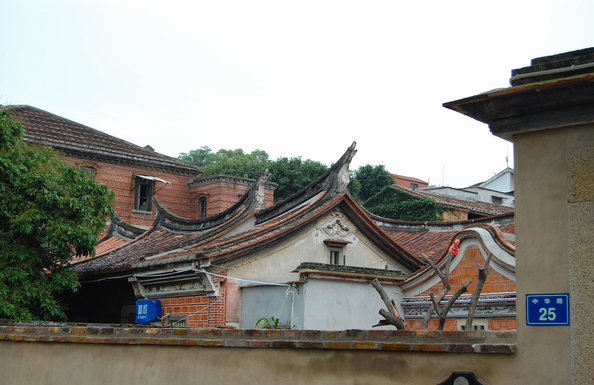 在大量的華僑洋樓建設中,體現出一些新風尚:一方面,立面上采用紅磚墻與少量白色線條對比的手法蔚然成風,延續了閩南紅磚厝紅磚白石的裝飾傳統;另一方面,以裝飾藝術風格為代表的裝飾元素逐漸流行,并融合常見的傳統裝飾題材及西方古典裝飾元素。