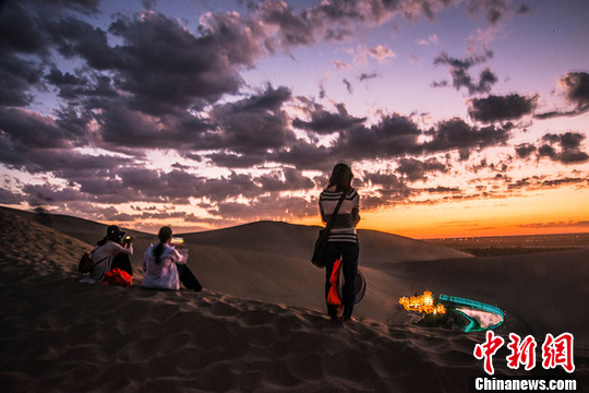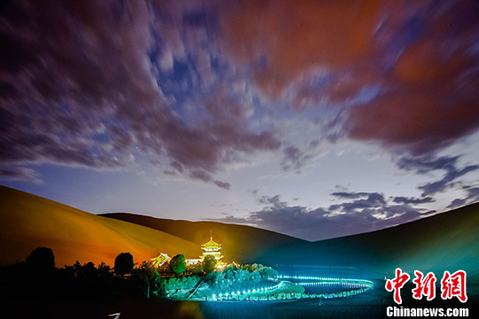 7月中旬,國際旅游名城甘肅敦煌進入旅游旺季,每天成千上萬的海內外游客來到當地著名鳴沙山月牙泉景區觀光游覽,觀賞大漠風光,感受敦煌文化,體驗民俗風情。傍晚時分,西邊的天空被晚霞染紅,美麗的月牙泉被寶藍色的燈光點綴著呈現出美輪美奐的闌珊夜色,大批游人沉浸于如夢如幻的迷人夜色里流連忘返。