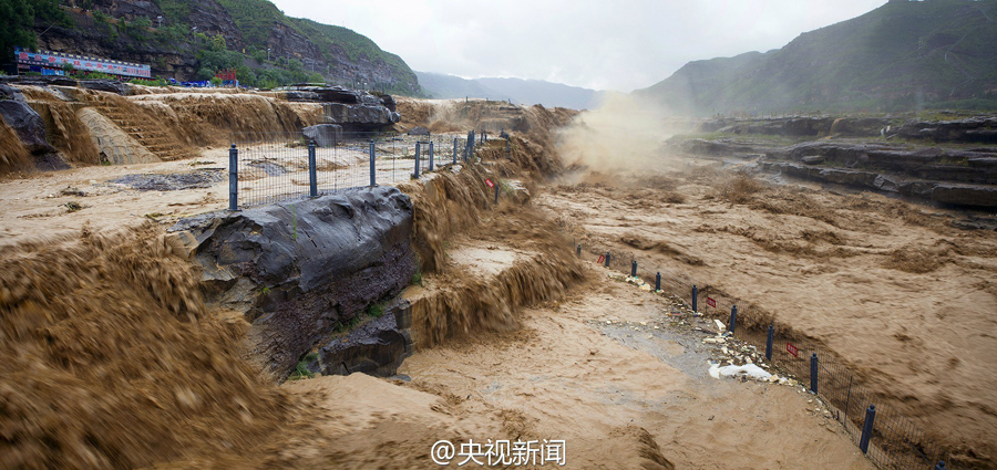 受上游強降雨和水庫放水影響,最近幾天,黃河壺口瀑布迎來伏汛,最大水流量達到每秒2600立方米左右,濁流滾滾奔騰而下,氣勢磅礴!(央視記者李志 文豪)