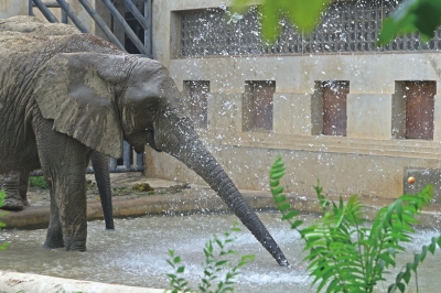 在大象展區,寬敞的運動場地上,淋浴噴頭頗為顯眼,下方還有一個半米多深的水池,天氣熱的時候,大象可以邊淋浴邊戲水,時不時甩開長鼻子吸起水來為自己沖涼。運動場上還有兩個七八米高的草棚,沖完涼的大象可以躺在下面乘涼休息。