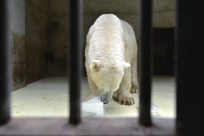 一般氣溫達到35度以上時,動物園飼養部門還將向北極熊、棕熊、小熊貓、金絲猴、大猩猩等重要場館運送冰塊,每塊冰大概凈重20-30斤左右,需要提前三天在冰庫中冷凍,一次性送冰8-10塊。同時為北極熊館配備冰箱,飼養員可隨時冷凍冰塊給動物食用。