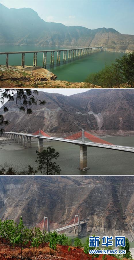 雅西高速瀑布溝庫區路段3座跨大渡河特大橋:青杠嘴特大橋(上圖)、觀音巖特大橋(中圖)、蘇村壩特大橋(下圖,拼版照片,攝于2012年4月12日)。1935年5月24日、25日間,紅軍“十七勇士”在槍林彈雨中,以一條木船強行從安順場渡河,在國民黨軍視為天險的大渡河防線上,撕開了一個缺口,為紅軍沿大渡河兩岸夾河北上奪占瀘定橋創造了有利條件。 “紅軍不怕遠征難,萬水千山只等閑?!遍L征譜寫了一曲人類征服自然的凱歌,峽谷激流、雪山草地、物資匱乏、生命禁區,這一切都不能阻擋紅軍前進的步伐。80年過去,滄海桑田,紅軍長征走過的荒郊野嶺,如今樓宇林立,欣欣向榮;徒步翻越的大山、攻克的關隘、沼澤遍布的草地、泅渡的河流,修起了通暢快捷的公路和大橋……長征之路發生了翻天覆地的變化,昔日的艱難險阻正漸漸變成康莊通途。新華社記者江宏景攝 |