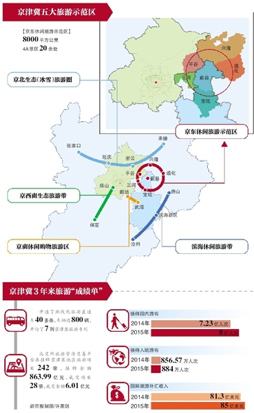 三地共同打造京東休閑旅游示范區、京北生態(冰雪)旅游圈、京西南生態旅游帶、京南休閑購物旅游區、濱海休閑旅游帶等5個旅游試點示范,成為三地共建旅游大格局的新標桿。家人出城休閑度假,可以選擇京東休閑旅游示范區;如果三五好友想體驗冰雪娛樂,則可到京北生態(冰雪)旅游圈;橫跨京冀兩地的房山世界地質公園,則是京西南生態旅游帶內的特色景點;而天津武清、河北廊坊則打造成為京南休閑購物旅游區。