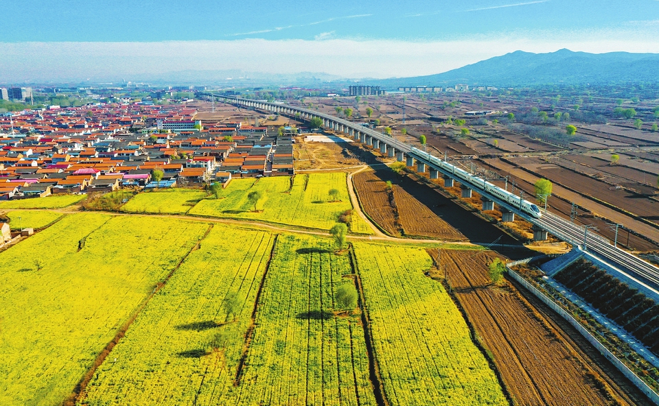 4月9日,長治市潞州區南垂村,金燦燦的油菜花海與村落、高鐵列車交織成一幅鄉村振興的田園畫卷,美不勝收。張海 張永清攝