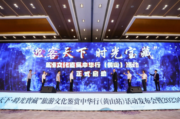大會最后,八位嘉賓共同上臺按下啟動按鈕,宣布“迎客天下 時光寶藏——旅游文化鑒賞中華行(黃山)活動”正式啟動。