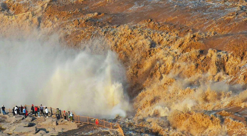 7月10日,游客在吉縣黃河壺口瀑布景區游覽觀瀑。近日,受上游降雨增多和萬家寨水庫調節放水影響,黃河干流迎來汛期,滾滾波濤奔騰而下,氣勢極為壯觀,吸引了眾多游客前來參觀。
