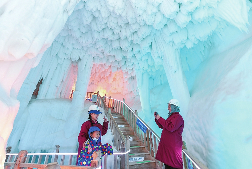 七月二十七日,在鄉寧縣云丘山景區超大冰洞群,游客在拍照留念。盛夏時節,這個奇妙夢幻的冰雪世界,吸引了數以萬計的游客。閆銳鵬攝
